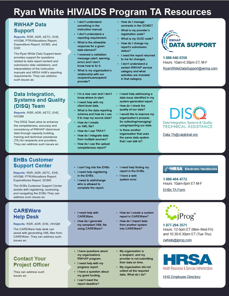 Please review the RWHAP TA Resources Quick Guide which outlines information about each technical assistance provider, including the reports they support, frequently asked questions they respond to, and their best contact information.